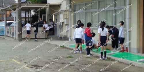 第19回小学生阪内川七夕まつりが開催されました。小学校を出発しようとしたところで、雨が降り始めたので、開催が心配されましたが、少し待って雨がやみ、阪内川まで笹かざりを持って歩きました。堤防の広場で、七夕まつりが始まりました。