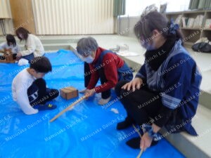 1年生が、糸つむぎの体験学習をしました。「ゆうづる会」のみなさんを講師に、『綿操り』『綿打ち』『糸つむぎ』の実演をみせていただき、実際に3つを体験させていただきました。国語科で学習する「たぬきの糸車」に関わる体験。地元の伝統工芸品である松阪木綿に関わる学習でもありました。