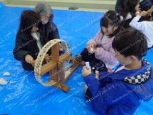 子どもたちは、しっかり話を聞いて、教えてもらって自分で紡ぐことができました。ゆうづる会のみなさんありがとうございました。