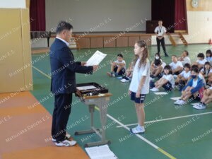 令和7年度後期のスタートです。1限目に、後期始業式を行いました。校歌斉唱の後、私から、「命を大切にすること」、「今を大切に何事にも全力で取り組むこと」「人にされて嫌なことは、ほかの人に絶対にしない、言わないこと」、「あいさつを自分からすること」を話し、みんなで確認しました。最後に、6年生にとっては、卒業に向けて小学校生活最後の半年、何事にも全力で取り組んで小学校生活を締めくくってほしいことを伝えました。おうちでも声掛けをお願いします。その後、後期学級委員、児童会役員の認証式、伝達表彰を行いました。