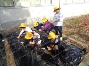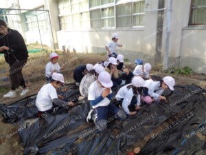 1・2年生、せいかつ科。学級園に大根のたねをまきました。