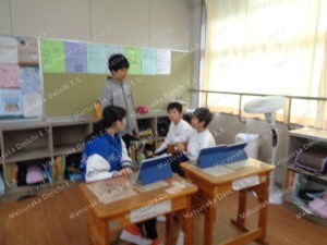4年生、総合的な学習の時間。先日の街の中の「だれもがくらしやすい工夫」についての調べ学習で見つけてきたことの確認をしています。