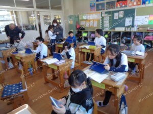 4年生、国語。タブレットを使ってアンケート調査を行う準備をしています。
