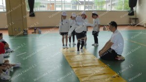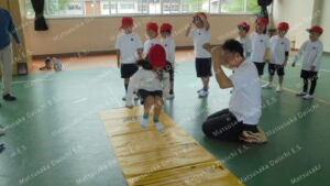 1・2年生、体育。体力テスト「立ちはばとび」の測定です。