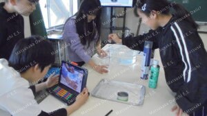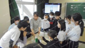 6年生、理科。「物の燃え方と空気」、気体の特徴を調べる実験をしています。ローソクの火はどうなるかな。