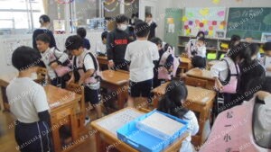 6年生の子どもたちが、1年生にライフジャケットの着方を教えてくれました。